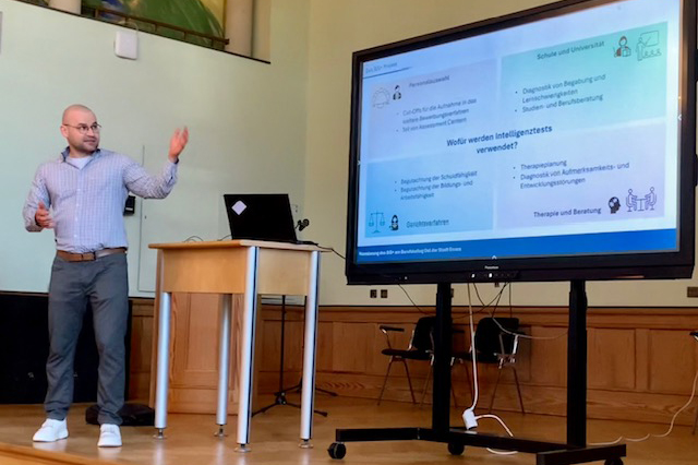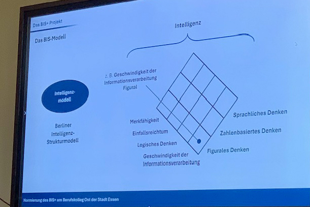 In einem spannenden Vortrag erläuterte Herr Dr Scherrer von der Uni Trier diese Inhalte und auch die Grundprinzipien der Intelligenztestung: Vom Modell über das Aufgabenmaterial bis hin zur Vergleichsstichprobe. Merkfähigkeit, Einfallsreichtum, logisches Denken und Geschwindigkeit der Informationsverarbeitung werden den Aspekten sprachliches, zahlenbasiertes und figuralem Denken gegenübergestellt.